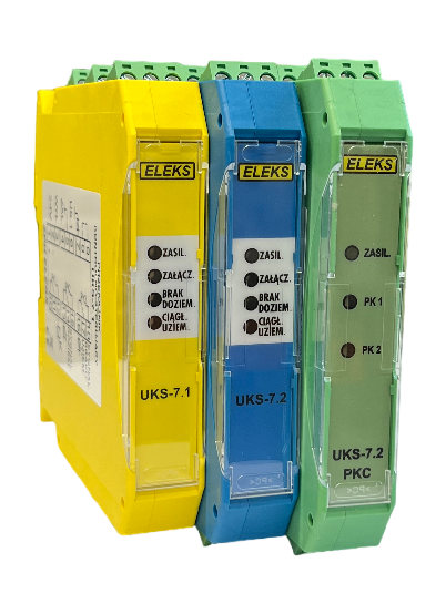 Przekaźniki kontrolno-sterujące typu UKS-7 są wykonane w ośmiu odmianach różniących się programem, rezystorami nastawczymi członu blokującego rezystancję doziemną izolacji i napięciem znamionowym kontrolowanej sieci.