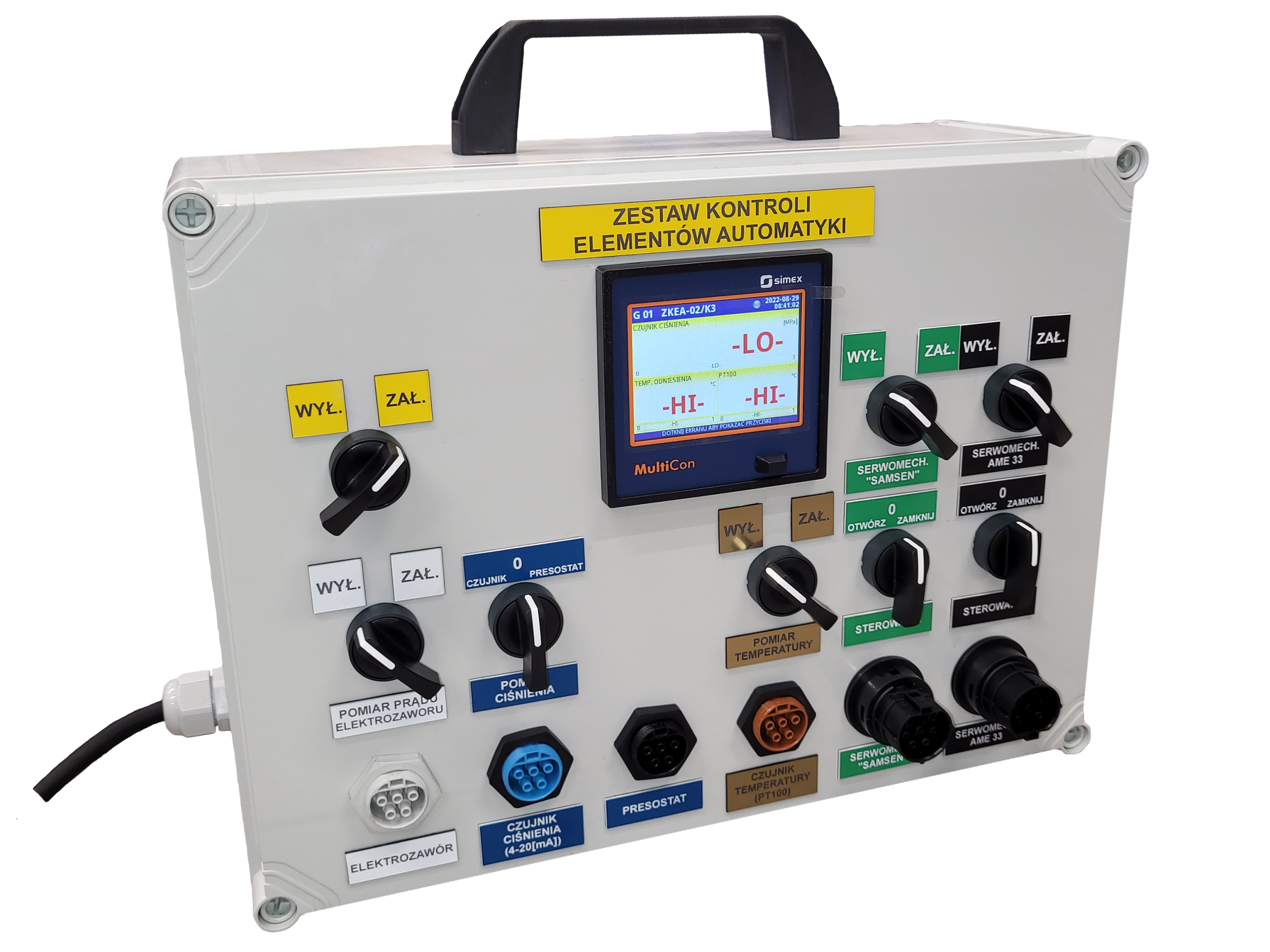 Zestaw kontroli elementów automatyki typu ZKEA-02/K3 przeznaczony jest do sprawdzenia poprawności wskazań czujników stosowanych w automatyce kopalnianej (PT100 i 4-20[mA]). Dodatkowo umożliwia przetestowanie elektrozaworu oraz dwóch rodzajów serwomechanizmów. Zestaw jest przystosowany do pracy w kopalnianej sieci 230[V] z izolowanym punktem neutralnym transformatora (układ sieci IT). Zestaw posiada przewód zasilający zakończony konfekcjonowaną wtyczką 230[V] AC.