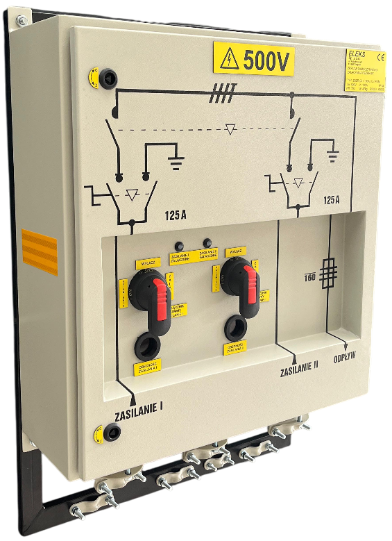 Zestaw samoczynnego załączania rezerwy typu ZSZR-05/100A/U/PON przeznaczony jest do automatycznego przełączenia dwóch linii zasilających. Zestaw przygotowany jest do podłączenia z zewnętrznym zestawem sterowniczym i wyprowadzoną sygnalizacją napięcia 24 V. Przystosowany jest do pracy w sieci IT o napięciu 500 V. Zestaw wyposażony jest w jeden odpływ główny oraz możliwość uziemienia obwodów zasilania celem uniknięcia napięcia zwrotnego do rozdzielni zasilającej. Zestaw przystosowany jest do zasilania odbiorników wyposażonych we własne zabezpieczenia w pozaprzodkowych wyrobiskach podziemnych zakładów górniczych niezagrożonych wybuchem. Zestaw przystosowany jest do pracy w kopalnianej sieci trójfazowej 500V z izolowanym neutralnym punktem transformatora (sieć typu IT).
